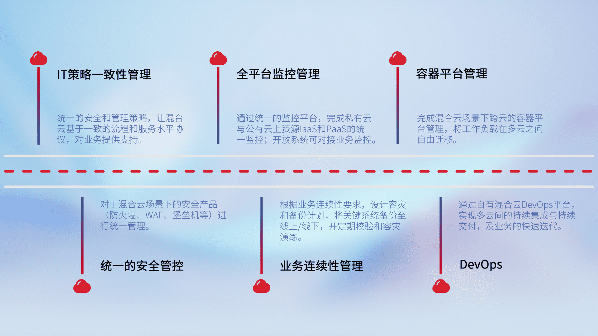 通过多云纳管,,,以统一的资源数据模型把客户的云资源进行抽象和封装,,,,进而实现对多云资源的统一操作,,,保障云资源管理的可靠性、、、稳定性与可用性。。量身定制化运维内容,,,配置、、、开发运维、、、补丁管理、、、备份、、、、监控、、、、认证和访问管理、、审计和日常巡检等,,保障在用云过程中的可靠度,,,,稳定度以及高可用率。。